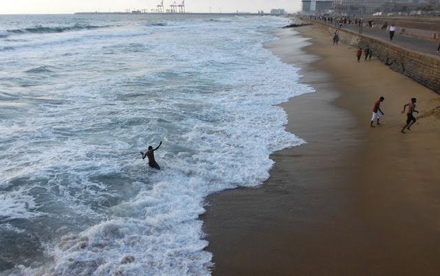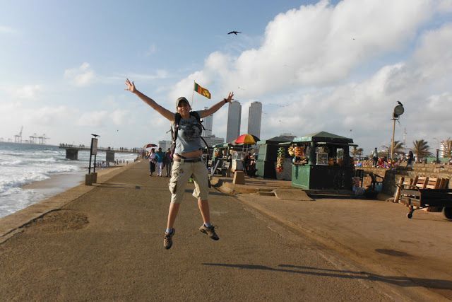 En el paseo hay niños volando cometas, familias remojándose los pies en el agua y muchos cuervos, en lugar de gaviotas. Los vendedores de comida, empiezan a preparar sus puestos de pescado frito. De momento no nos atrevemos a probar nada, dado que vamos a dormir en un tren y no sabemos lo lejos que nos pillará el baño. Un montón de hombres en chándal, seguramente militares, hacen ejercicio perfectamente coreografiados. Presidiendo todo, una bandera enorme de Sri Lanka ondeada por el viento.