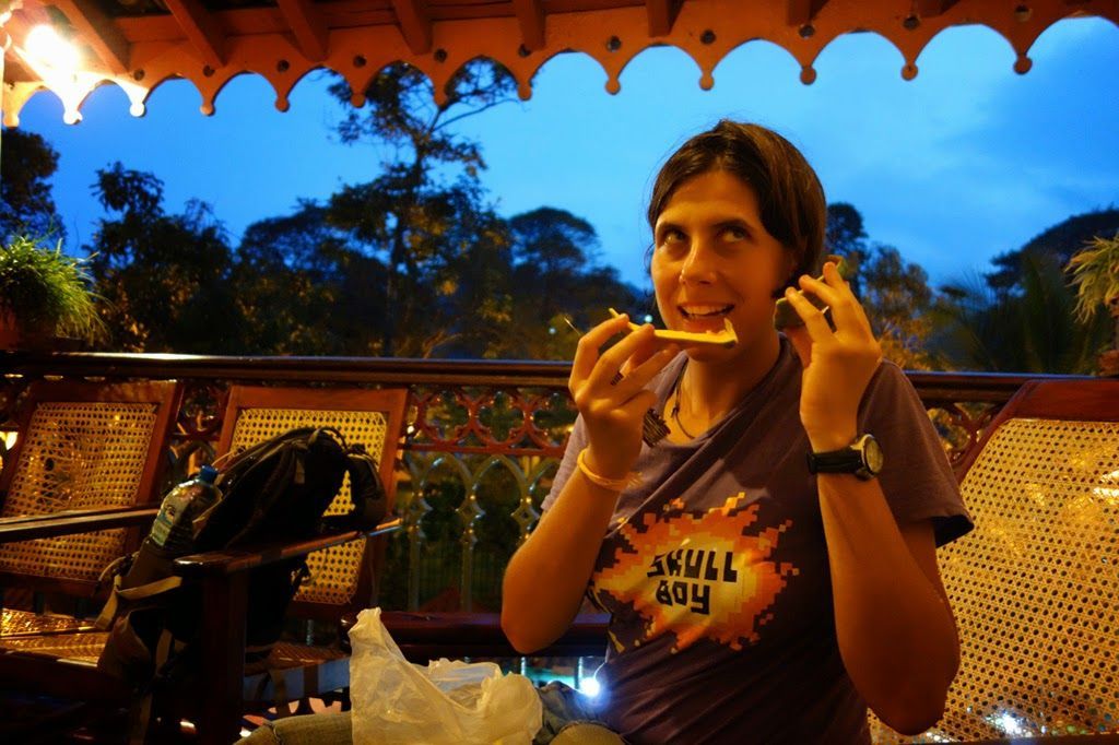 Hoy nos sentimos verdes así que decidimos ir a ver el jardín botánico de Peradeniya, no sin antes parar para desayunar en nuestro adorado White House, para ponernos moradas. Una especie de samosas muy picantes y pasteles de chocolate y nata regados con un enorme batido de helado de fresa constituyen mi ligero desayuno, no sea que me vaya a dar una lipotimia o algo por una bajada de azúcar. Juas.