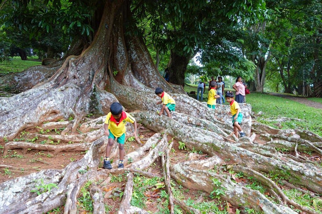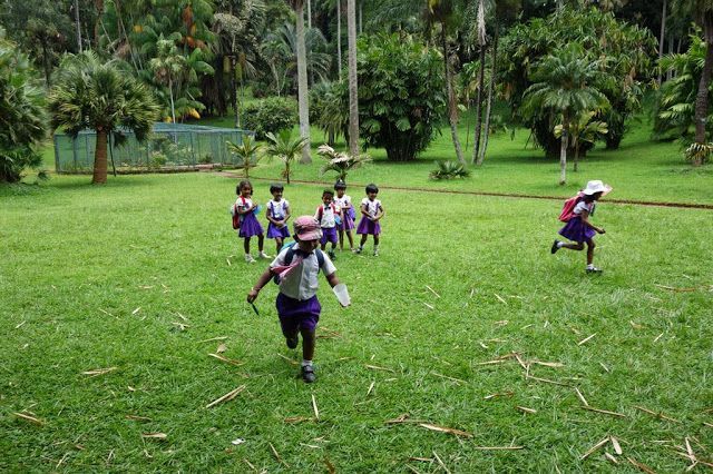 Aunque hay mucho tráfico llegamos enseguida porque los jardines están sólo a 6 kilómetros de Kandy. Nada más saltar del autobús nos convertimos en la principal atracción de un montón de niños pequeños uniformados que hacen cola para entrar en el parque. Los críos nos saludan con sonoros