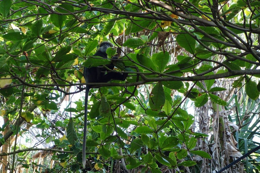 Desde allí unos monos, que parecen gremlins, están montando un escándalo tremendo en las copas de los árboles. Las olas rompen contre el espigón.
