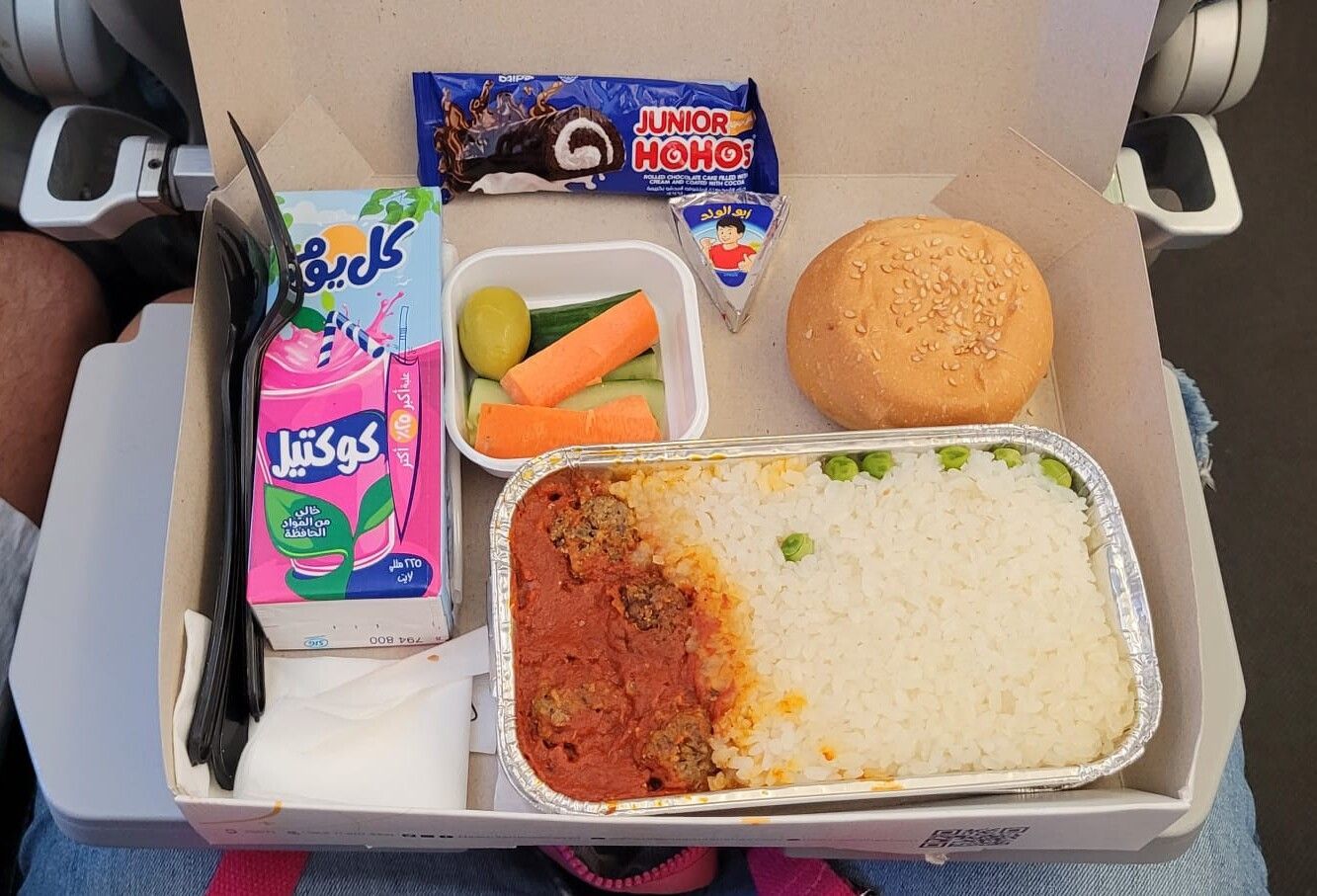- En un vuelo de más de 4 horas y media nos dieron tanto a la ida como a la vuelta algo de comer. A la ida un plato caliente de albóndigas con arroz y a la vuelta unos bollitos con queso y fiambre.