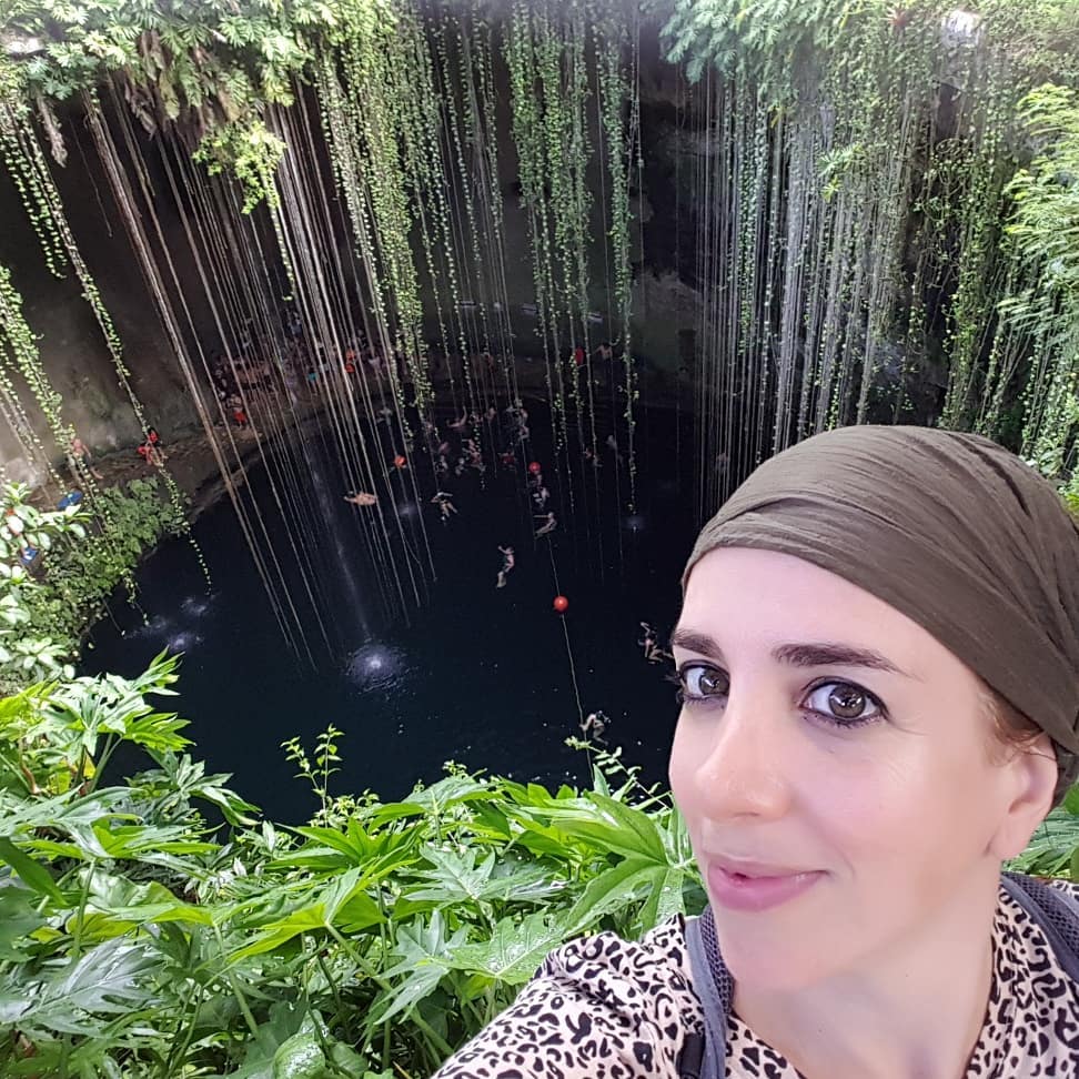 - Cenote Ik Kil: Está más lejos (cerca de Chichén Itzá) pero merece mucho la pena. Su círculo casi perfecto, la vegetación colgante y su profundidad lo convierten en nuestro favorito. Si sientes que te cansas mucho en el agua es normal. Este cenote tiene mucha profundidad y el agua tirará de ti un poco hacia abajo, por las corrientes subterráneas. Hay cuerdas para descansar, pero la gente las pisa, con lo que no siempre están disponibles para agarrarlas. Pero no tengas miedo, no pasa nada.