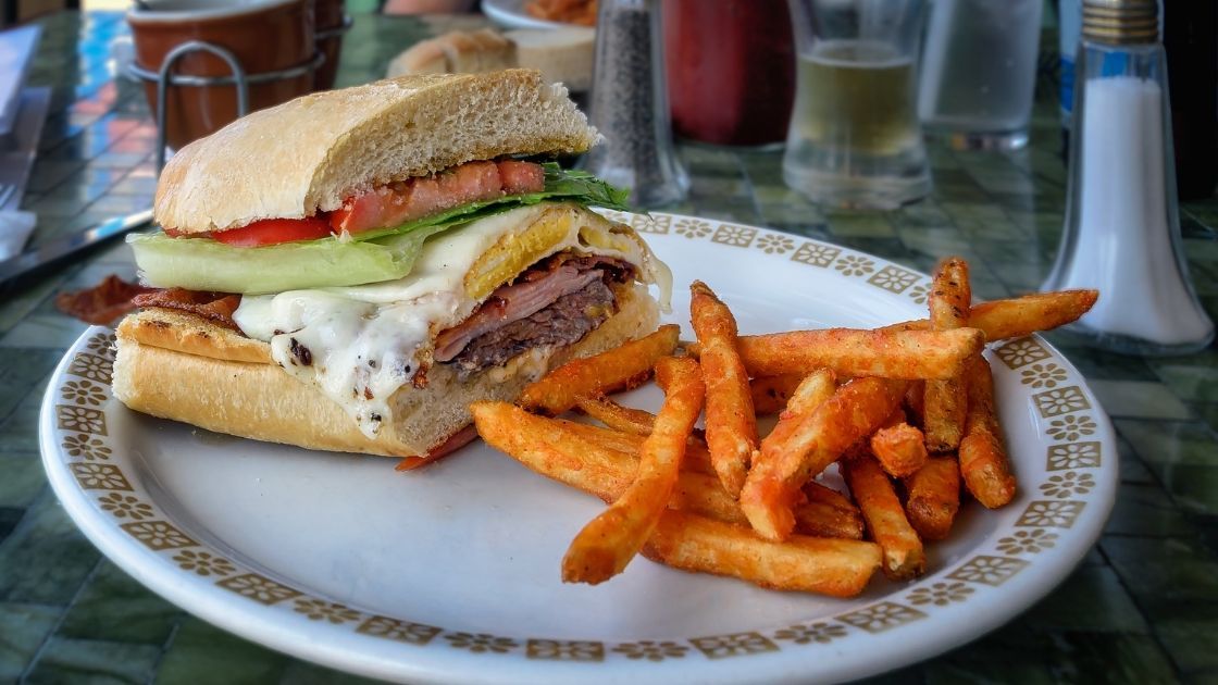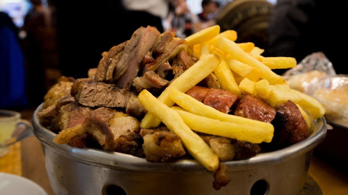 Es una especie de hamburguesa, pero la carne es un “churrasco” (un filete de lomo) pero ojo, de vaca, no de cabra, a pesar de su nombre. Se dice que se inventó en Punta del Este en un restaurante cuando una argentina pidió carne de chivito. Le prepararon un bocadillo, pero con un churrasco. La cliente quedó encantada, y nació el chivito. El más clásico suele llevar también jamón cocido, panceta, queso, lechuga y tomate, acompañado con papas fritas.