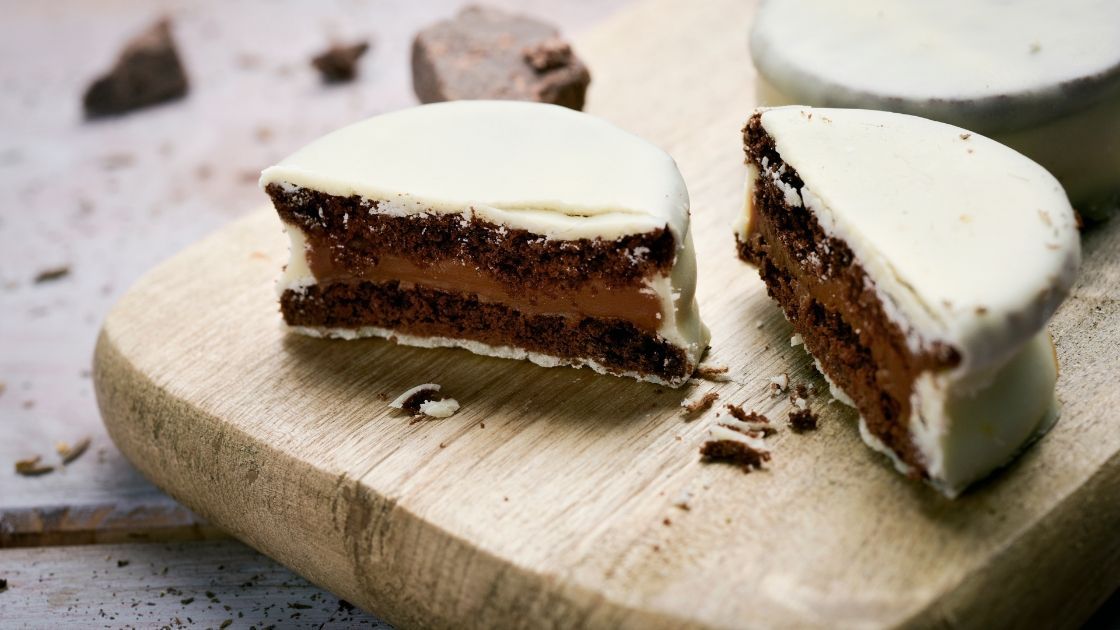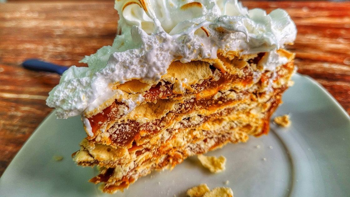 Una tarta deliciosa compuesta de merengue, bizcochuelo, crema doble (nata), durazno (nuestro melocotón) y la frutilla (nuestra fresa). También puedes encontrarla hecha con dulce de leche y chocolate.