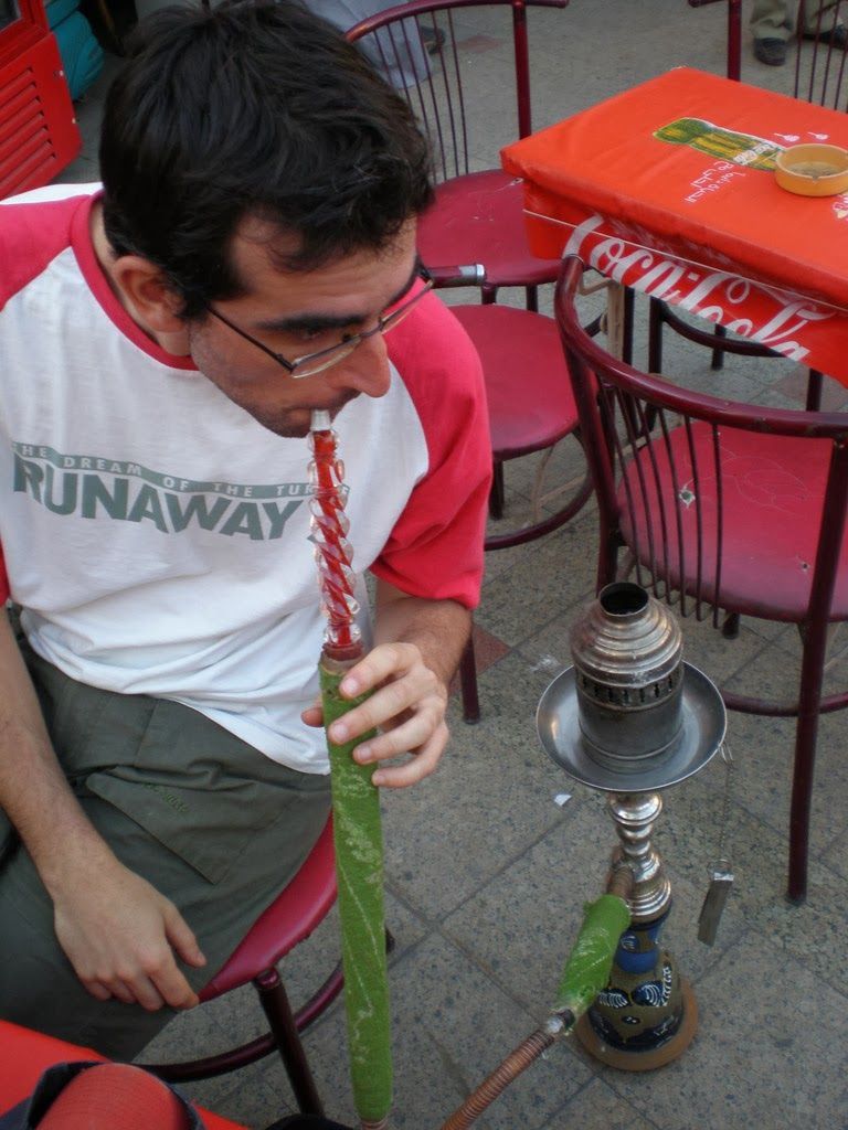 17.30 Nos sentamos en una plaza a fumar una shisha. Mientras, un par de hombres se hacen una cara nueva a base de hostias. Como en el palmeral donde está atracado nuestro barco no hay nada, decidimos cenar en Luxor, antes de volver al barco. ¡No nos ponemos de acuerdo! María y Eva deciden encargar comida y Alberto y yo nos arriesgamos con unos bocatas de falafel que nos salen por 1.60€ los dos. Conocemos a un joven egipcio que nos cuenta en un perfecto español que se viene de beca a España a la autónoma el año que viene. Le damos nuestro email.