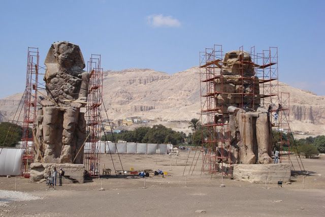 12.15 Como en los valles no nos hicieron descuento, decidimos ahorrar volviendo a comer al barco, que para eso lo teníamos pagado. De camino, nuestro taxista nos paró en los colosos de Memnom, que no teníamos previsto.